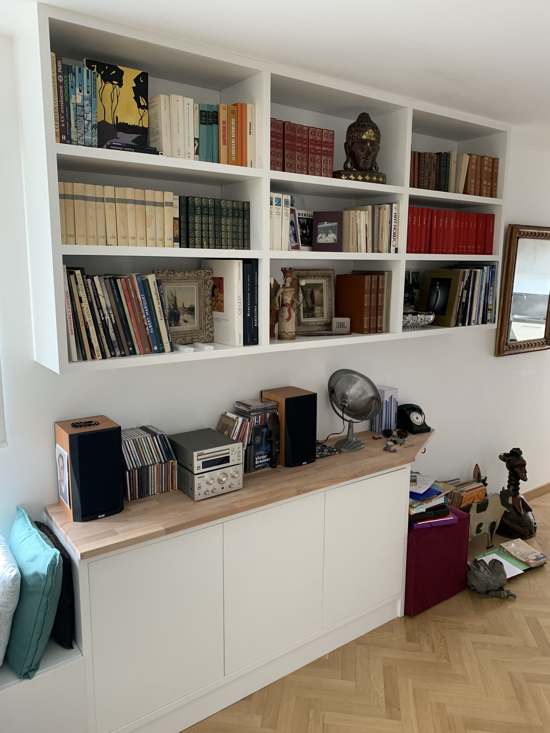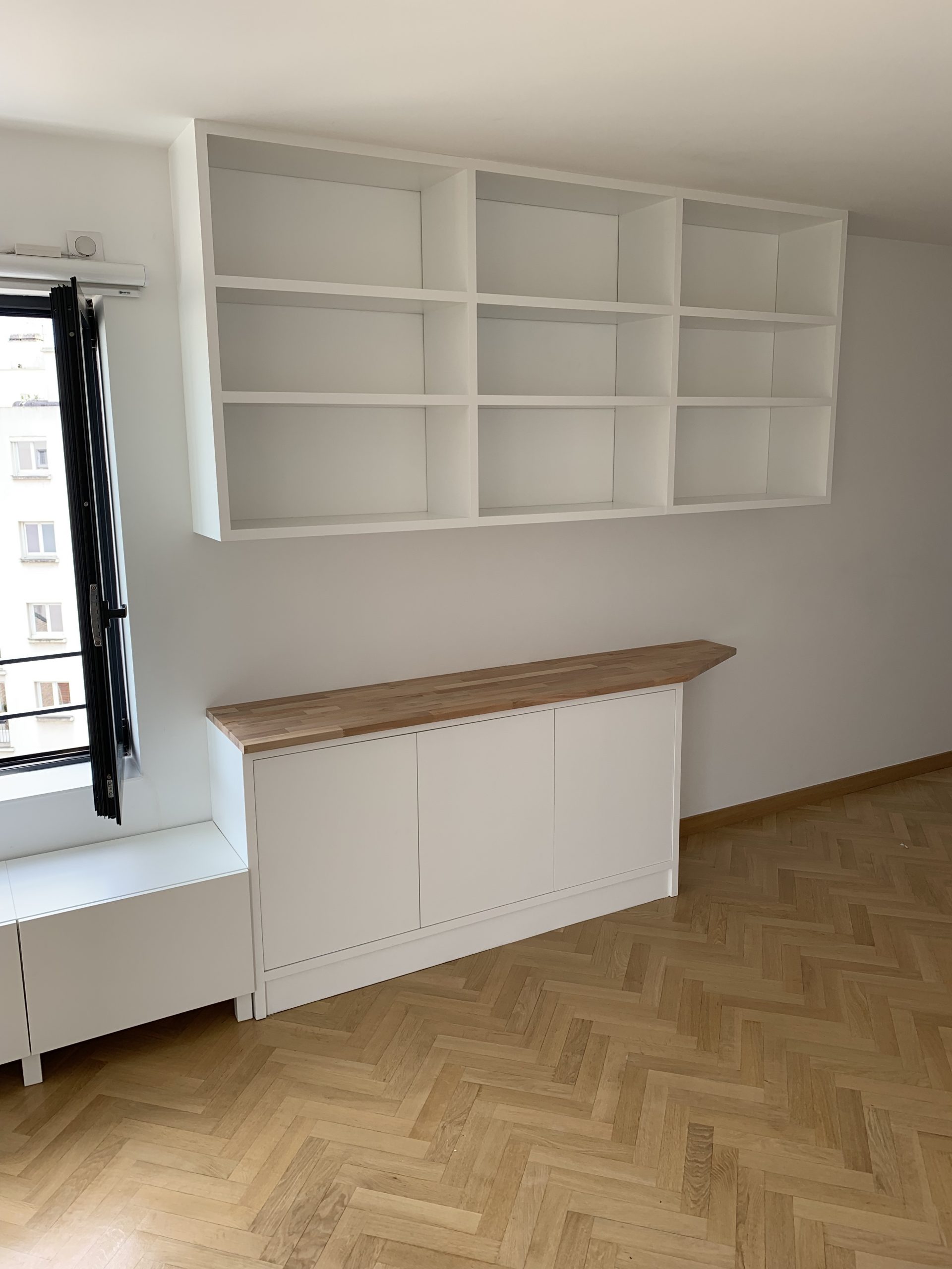 Notre cliente souhaitait aménager son nouvel appartement parisien et y intégrer des rangements et un bureau de travail en optimisant les différents espaces.