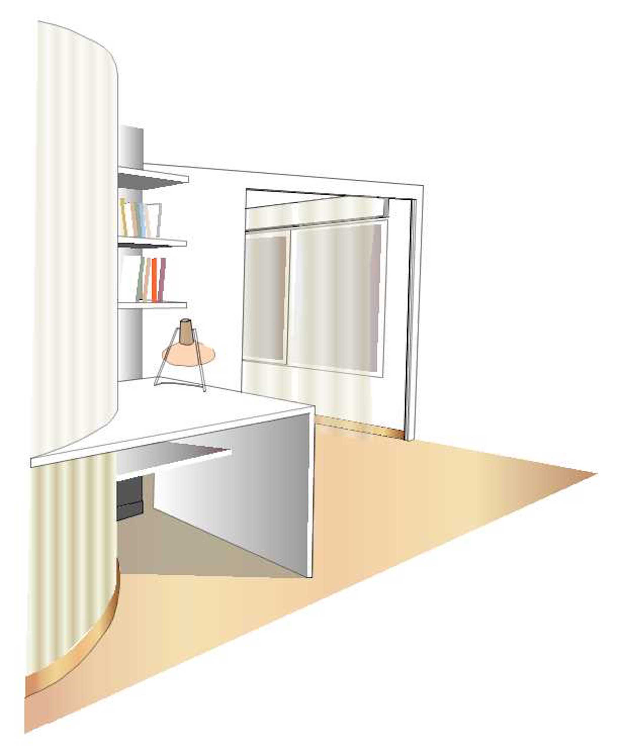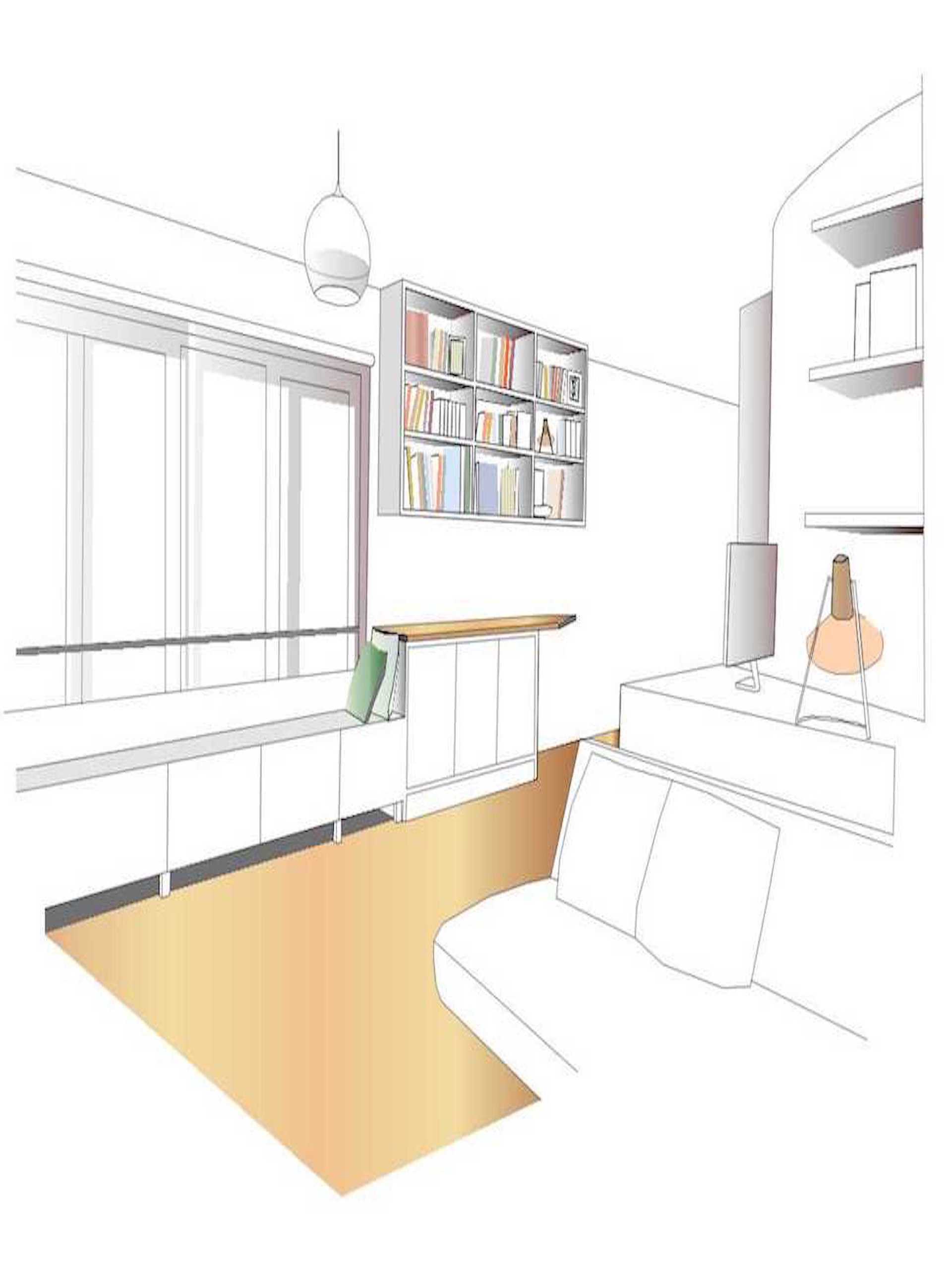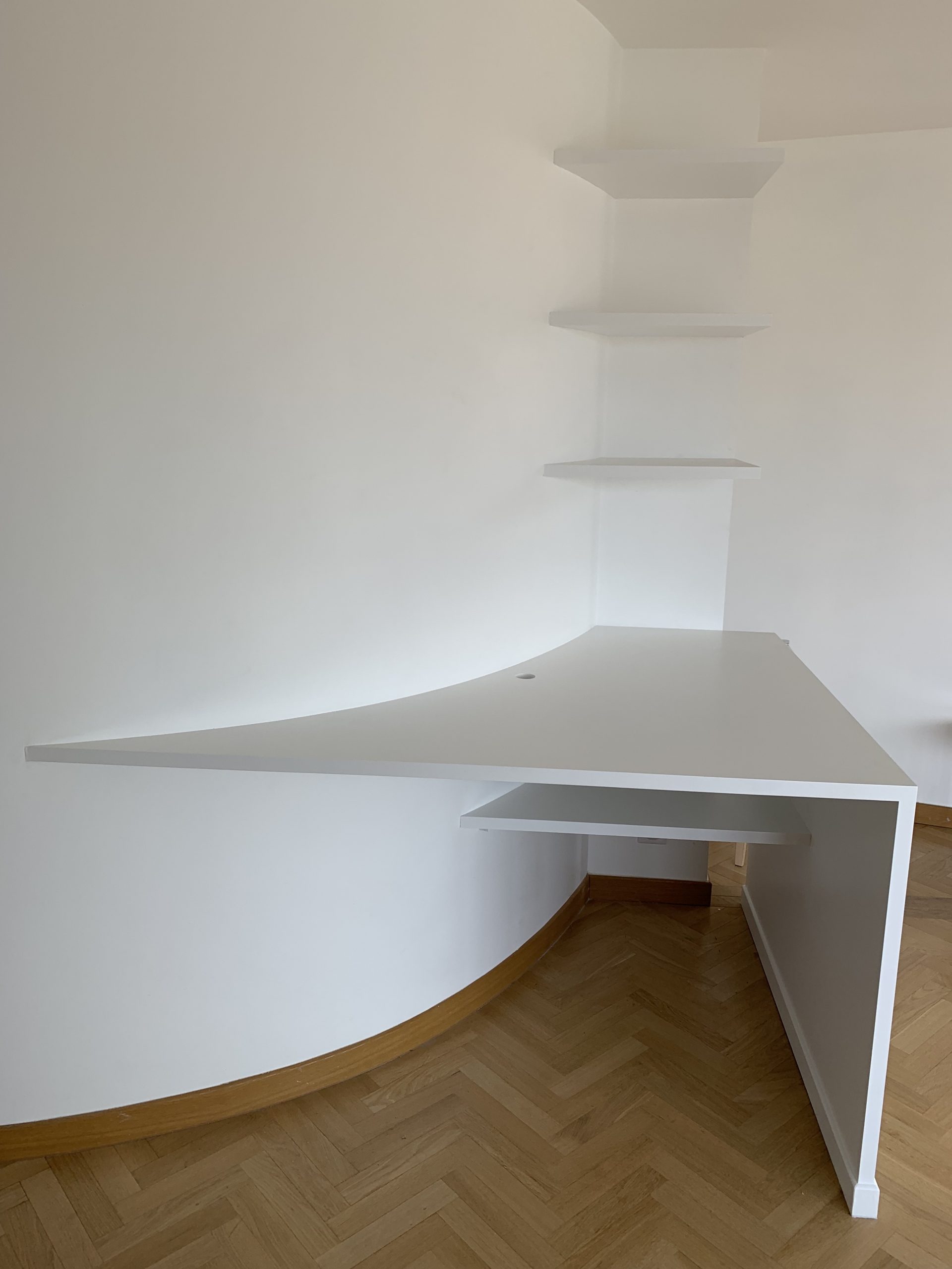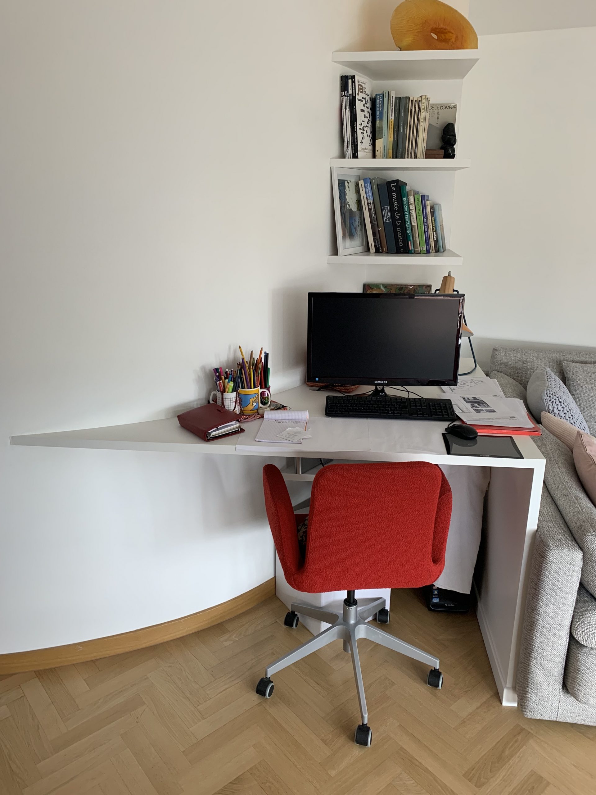 Le bureau vient épouser la forme arrondie du mur, des étagères invisibles pour optimiser un pan de mur et créer plus de rangement.