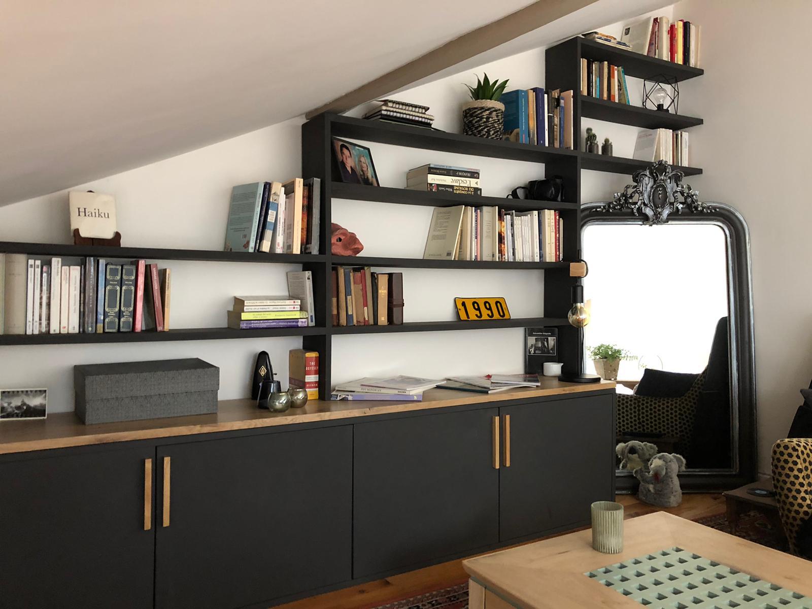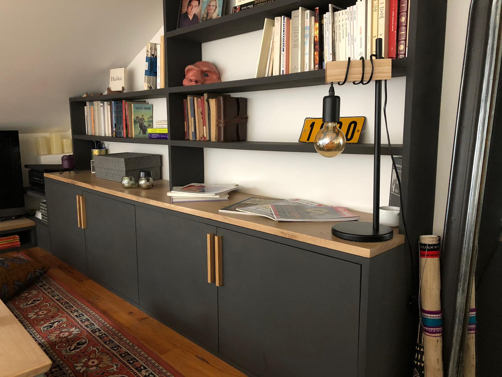 La structure est en plaqué noyer, les cadres à persiennes verticales sont en noyer massif. Les façades laquées blanc mat et les vernis sont réalisés par nos soins, en cabine.