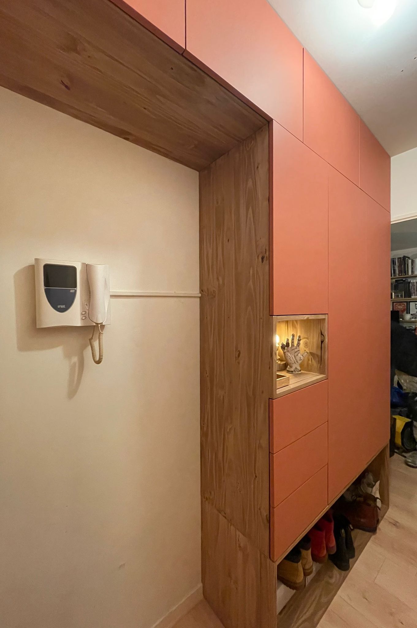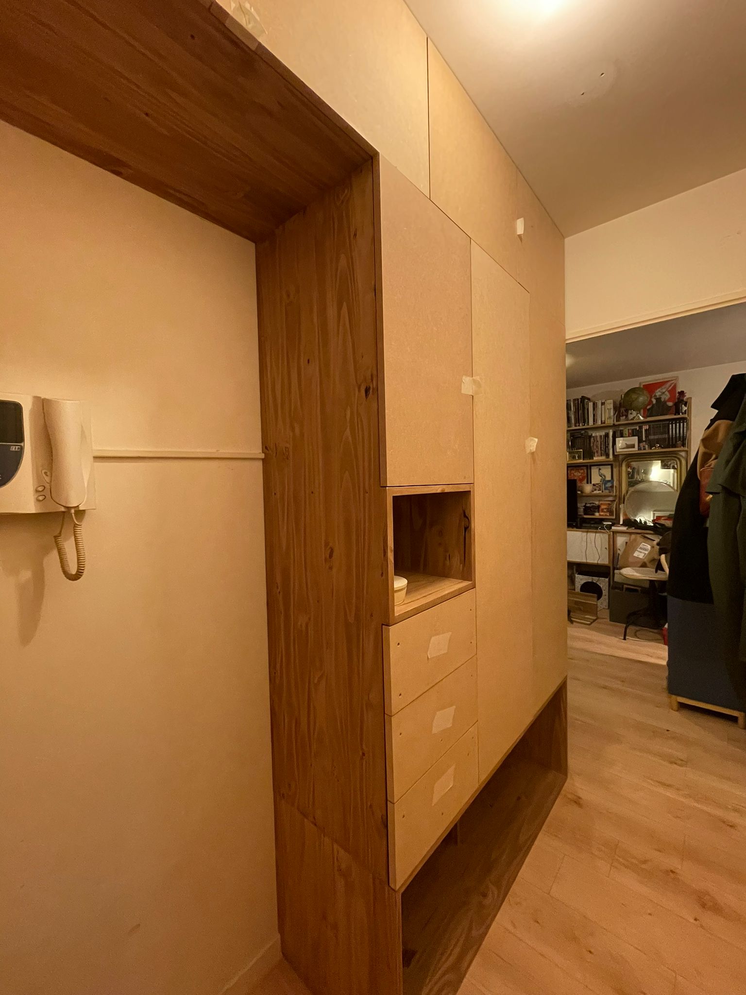 Nous avons créé un meuble de rangement avec dressing intégré et tiroirs. Un arche de prolongement avec des caissons hauts permettant d’optimiser davantage l’espace sans gêner l’ouverture de la porte d’entrée.