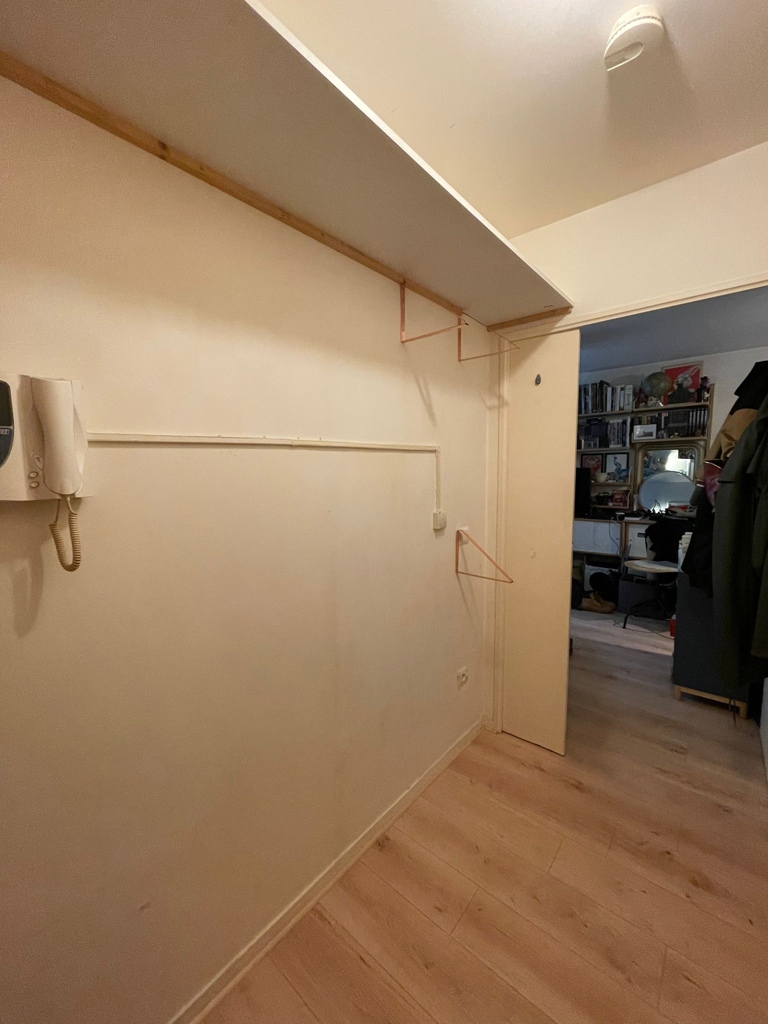 Notre cliente souhaitait aménager l’entrée exiguë de son studio avec un meuble dressing et des rangements. Ce meuble devait habiller l’espace et marquer la séparation avec la pièce de vie.
